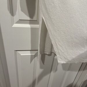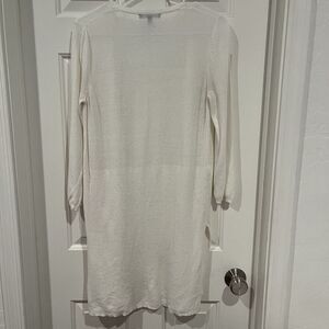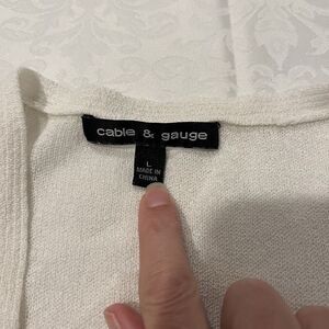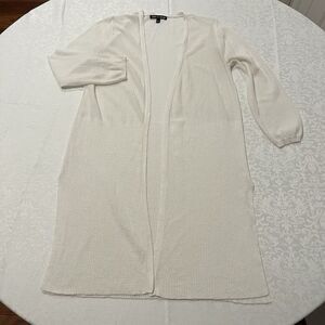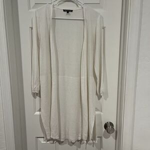 Cable & Gauge Large White Open Front Cardigan Sweater. Measurements in the pictures. The length is to the mid thigh, so it’s a longer cardigan. Slits on both sides as shown in pictures. No material tag but obtained material from another listing.