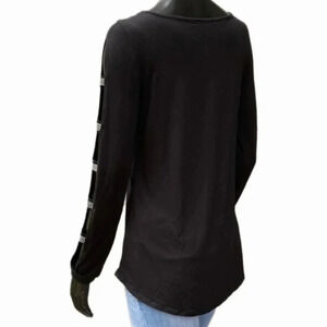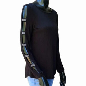 Long sleeve lightweight top. Open slit down the entire length of the sleeve. Entire top is stretchy except for the rhinestone studded bands connecting the 2 sides of the open slit on sleeves.