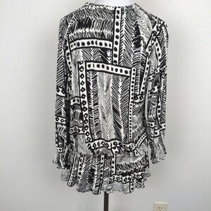 Cable & Gauge black and white/cream pheasant top. Women's size Large. Shirt has elastic hem around the neckline, both sleeves and around the waist. 97% viscose 3% spandex. In excellent condition.