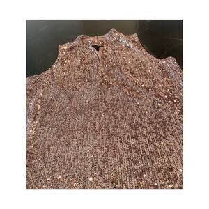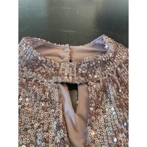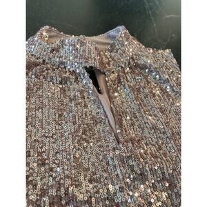 ladies shimmery sequined top from Cable and Gauge in size large. Fully lined with some weight to it. beautifully made with a striking front neckline (has a V with a strap across it at the throatline) and a keyhole back closure with 2 silver buttons. Goes so well with slinky slacks or a mini skirt. even looks great under a blazer but really shines for an evening on the town.