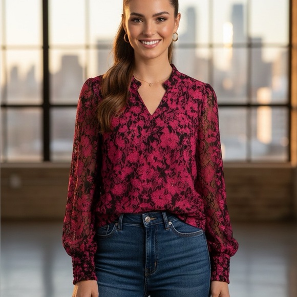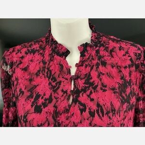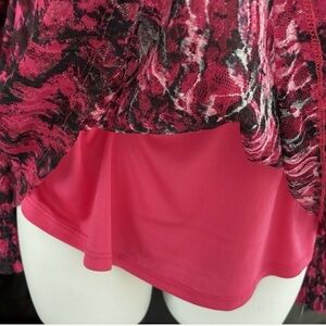 Chic floral lace blouse in vibrant pink and black. Perfect for any occasion. Pair with jeans or a skirt.