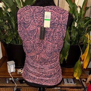 This elegant tank top by Cable & Gauge showcases a vibrant pink and blue paisley pattern with ruched detailing, offering a chic and comfortable style. The sleeveless design and lightweight fabric provide a flattering fit and ease of movement.