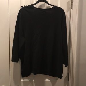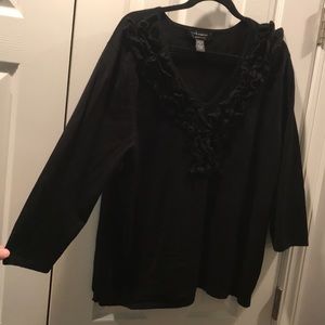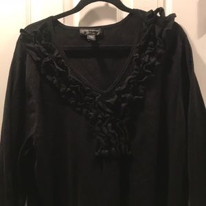 Cable & Gauge Ruffle Sweater in Black. 3/4 sleeves. Soft sweater material and easy to wear. Ruffle detail on front. V neckline. Size 2X. Like new; no tags.