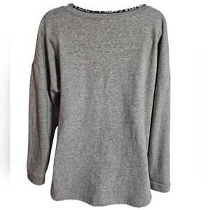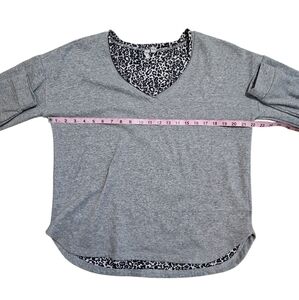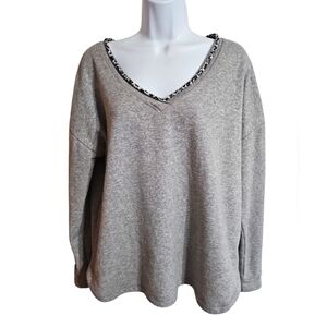 Medium cotton V-neck grey sweater with a contrasting leopard print. The material tag is missing. Heavy and warm. Perfect for fall, winter, and every day wear.