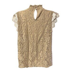 Cable & Gauge Top L Beige Lace Sleeveless High Neck Blouse Ruffle Detail