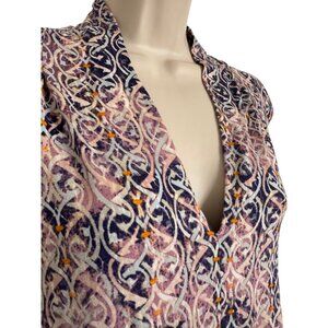This vibrant women's tank top features a stretchy fit and a pleated V-neck design. In excellent used condition, it offers a blend of purple and pink hues, perfect for casual outings or layering.
