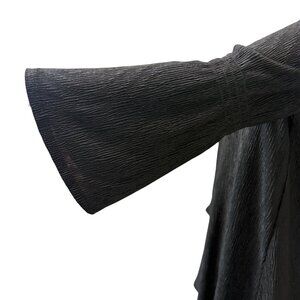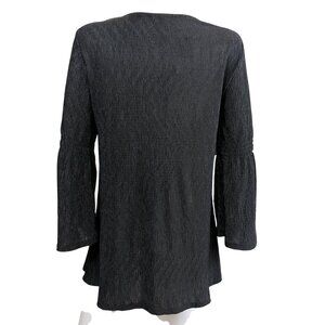 This lightweight black tunic top by Cable & Gauge features a textured design with long bell sleeves and a scoop neckline. Comfortable and breathable, perfect for casual wear.
