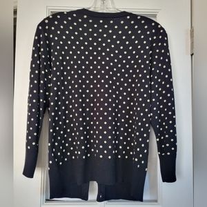 Lightweight cardigan sweater. Black with off white polka dots. Size small. Length 24 inches. Bust measures 18 inches across. Excellent condition.