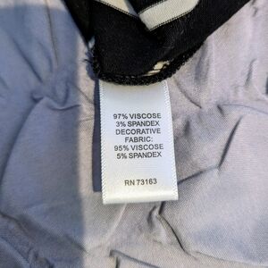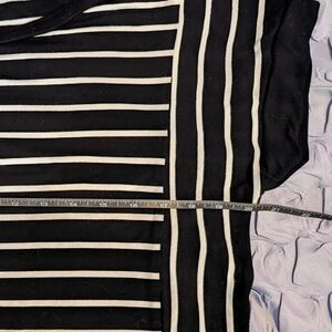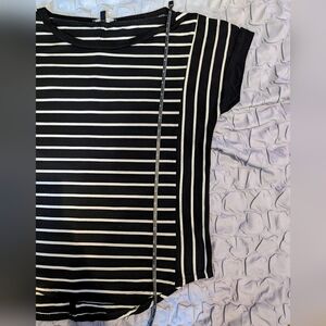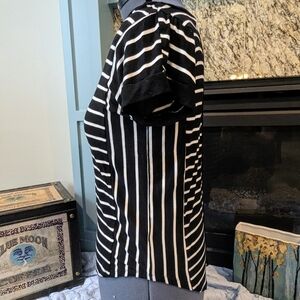 Casual and timeless black tee with white horizontal and vertical stripes. Stretchy viscose spandex blend, with faux decorative back button detail. The buttons are fixed and decorative only, they don't actually unbotton.