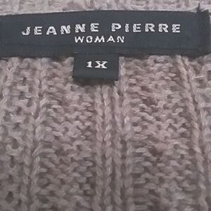 Soft cotton cable knit and waffle weave tan sweater by Jeanne Pierre. 4.5" slit up from each side of the hem and a nicely shaped subtle scoop neck. This is a cozy and snuggly sweater for cold winter days and nights. Paired with a soft pair of leggings, lounge pants or your favorite jeans and skirts it offers comfort in body and mind. And, looks classically stylish as well. A classic cable knit sweater is a staple piece in most people's closets for a reason. In excellent pre-owned condition with no flaws.