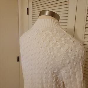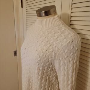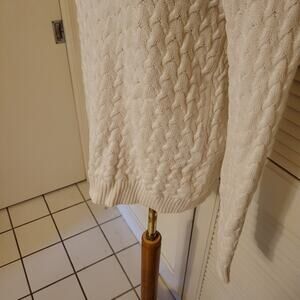 white sweater, cable knit sweater, Studio Works, women’s medium, crewneck pullover, classic style, ribbed cuff, cozy knit, minimalist fashion, neutral sweater, winter layering, preppy, casual chic, comfortable sweater, basic knitwear, timeless wardrobe