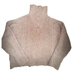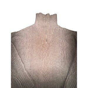 This cable-knit half-zip sweater combines a sophisticated tan hue with a high collar and ribbed detailing, offering both warmth and style.