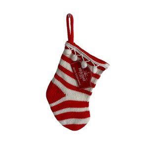 Cable Knit Mini Sweater Knit Christmas Stocking Red White Striped Pom Poms NEW