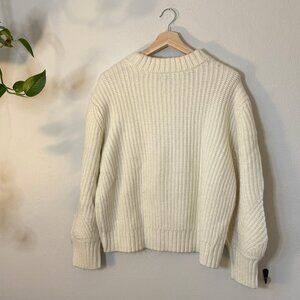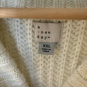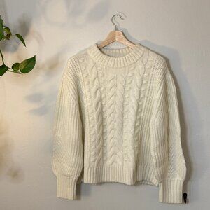 This A New Day white cable knit sweater is a cozy and versatile addition to any wardrobe. Featuring a classic cable knit pattern, a slightly cropped fit, and long balloon sleeves, it’s perfect for layering.