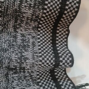 This is a gorgeous sweater made by cable & gauge in blacks and greys. It has fringe going down both sides and it does have holes for your arms but when it's on it does look like a poncho Style but it is straight across on the bottom. It has a nice round neck. It's made to fit a little oversized the measurements are lying flat pit to pit 22 inches across and the length is 27 inches down. Excellent condition !! Gorgeous on. Wear with legging n boots or a skirt.