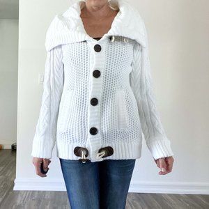 White cable knit sweater with dark brown wood buttons & toggles. Oversize fit, super comfy. New, only worn for photos.