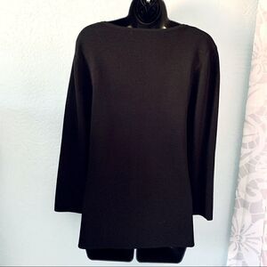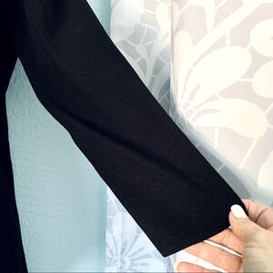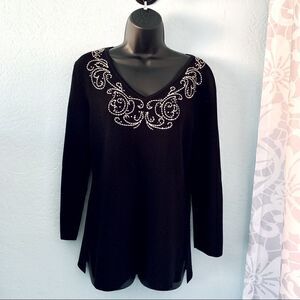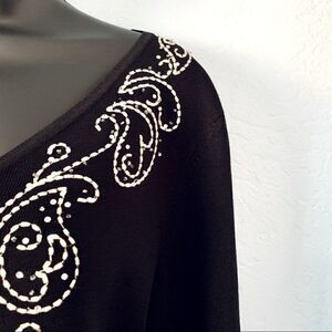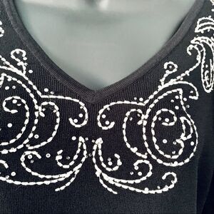Pretty black knit sweater top. V-neck with cream embroidery & rhinestone embellishments around neckline. Split side hem. 3/4 length sleeve. Viscose/nylon fabric. In excellent used condition.
