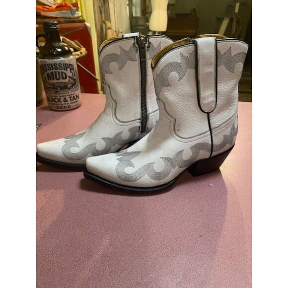 Caborca by Liberty Black. Danny Booties Size 7. Distressed leather embroidered side zip detail. Lightly cushioned footbed with 7" shaft and snip toe. 2" heel. MAF049 is the style number. NWOT.