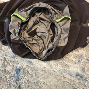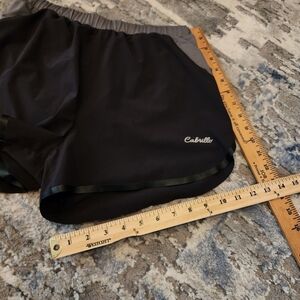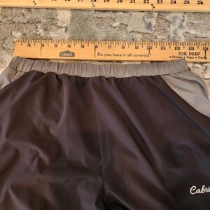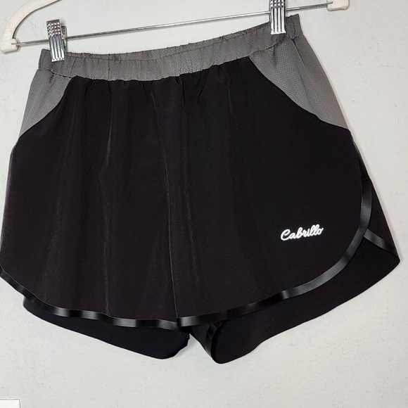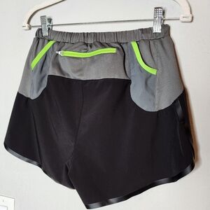 Cabrillo black and grey running shorts with built in underwear. green zippers and trim.