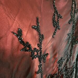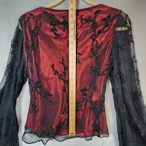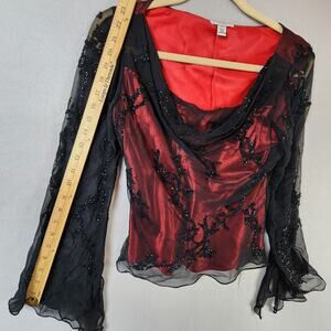 Caché 100% Silk Sheer Blouse Medium Beaded Bell Sleeves Red Black