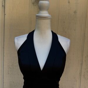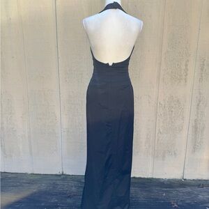 Elegant black satin full length gown by Caché. Halter neck, low back. Gorgeous! Perfect for formal occasions. New with original tag.