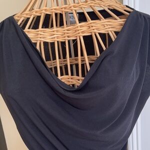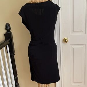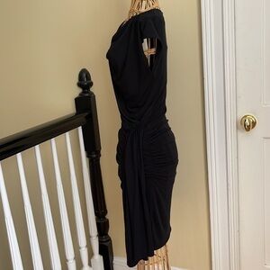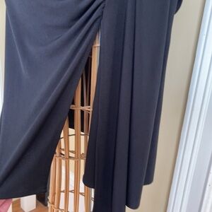 Love this dress. It’s sexy it’s classy. Has a split on one side with some material overlap.