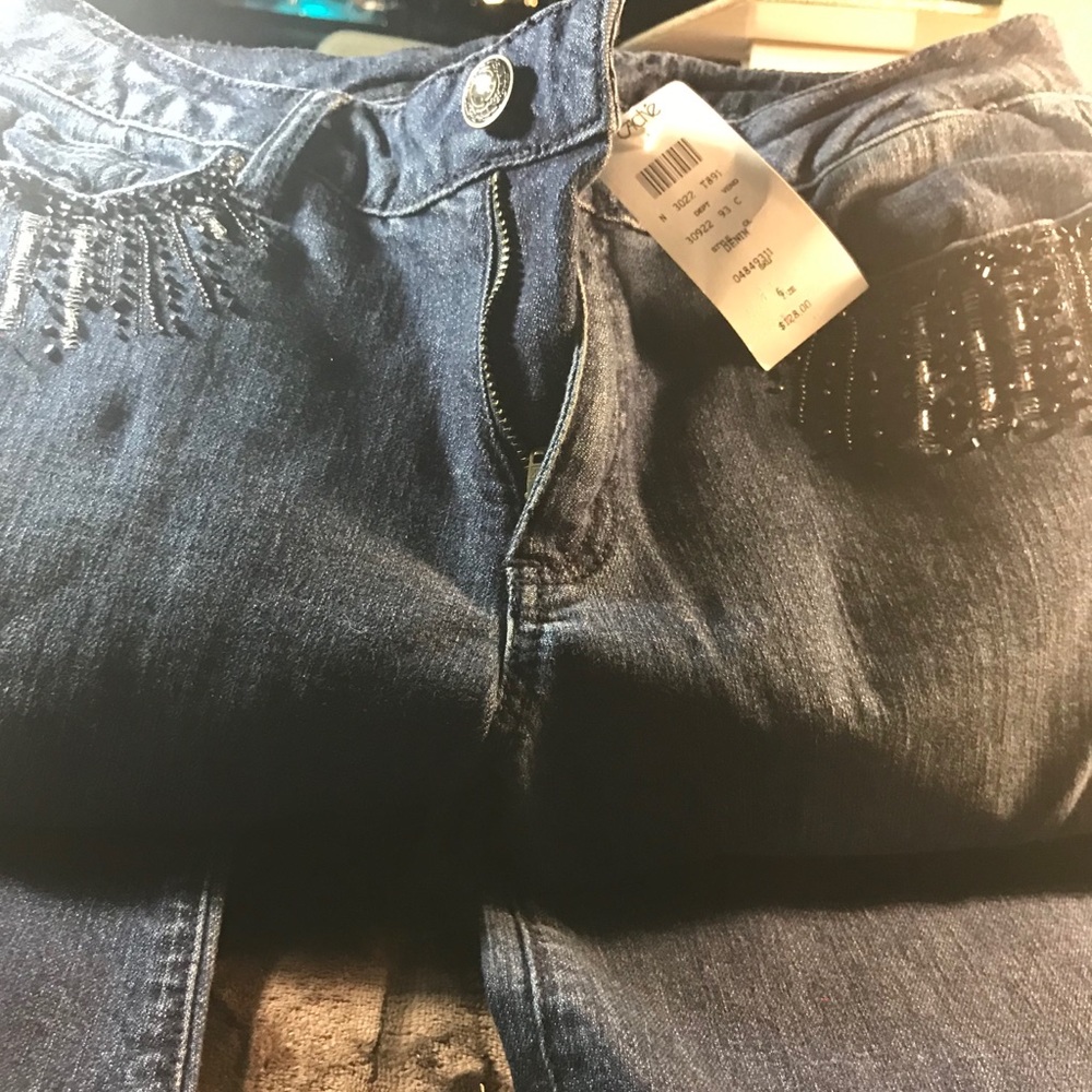 These are a pair of size 6 Caché jeans w/ rhinestones on the pockets. Never worn w/ tag still on them. Legs flare out a little.