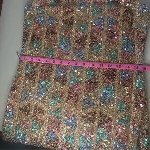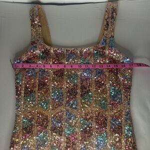 Turn heads in this stunning Caché vintage sequin cocktail dress. A true Y2K party look, this sleeveless mini/midi dress features an all-over geometric sequin design in rainbow iridescent tones against a gold base. Perfect for nights out, New Year’s Eve, prom, or collectors of iconic early 2000s fashion.