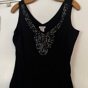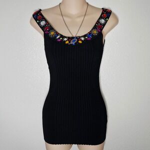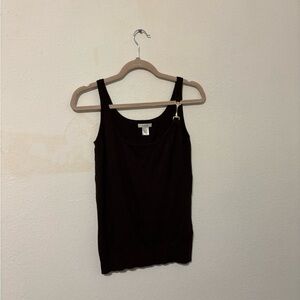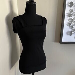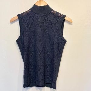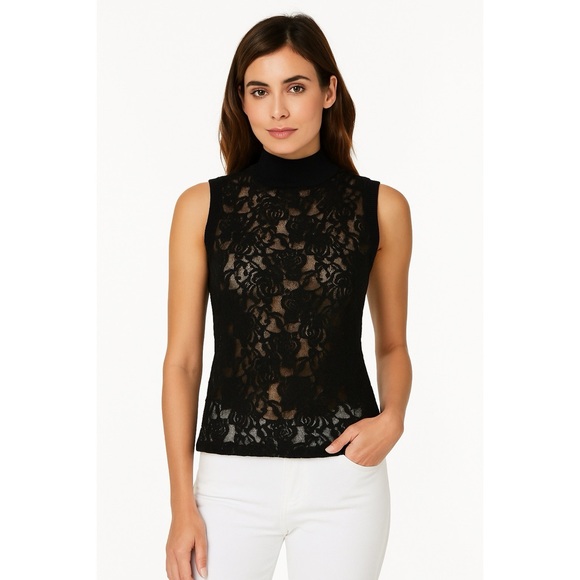 Caché | Sheer Lace Ribbed Mock Neck Sleeveless Blouse Tank Top