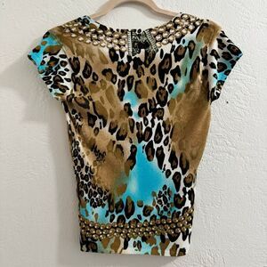 Stretchy viscose/nylon/spandex knit retro multi-pattern animal print turquoise and brown fitted 2010s top with rhinestone embellishments.