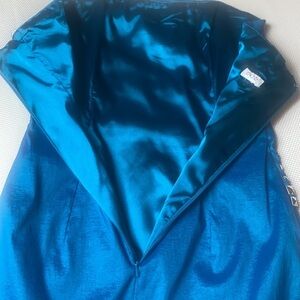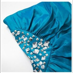 Very nice Caché Stunning Strapless Teal Cocktail Dress size Small. Has boning to help stay in place. Hanging straps have been cut off. The color is teal but some photos look blue. See photos for details.