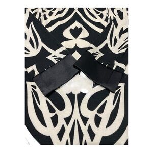 This long sleeve black and white midi dress from Caché has a fun black and white pattern. Despite the whimsical design, it still has a formal feel. It is 36 inches in length and is 16 inches across. The fabric is stretchy.