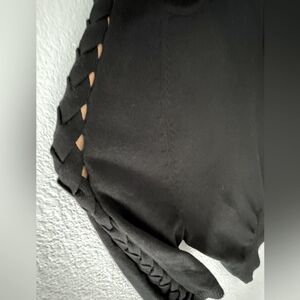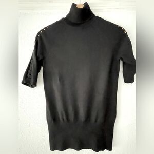 Short sleeve black pullover by Caché. This knit sweater has a turtle neck and braided cut-out pattern on top of the shoulders and down the sleeves. It's a great closet staple, with a very classic touch but still unique.