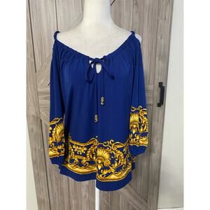 Blue with shades of gold keyhole front with tie gold hardware, 3/4 sleeve cold shoulder with braided straps