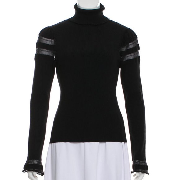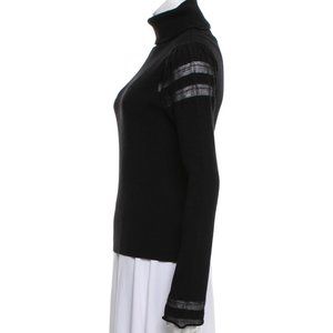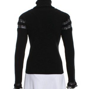 Black Cacharel rib knit turtleneck top with long sleeves and tonal metallic trim.