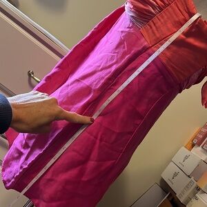 Caché brand orange and hot pink 100% silk halter top that features a padded bust area, a tie at the neck, side zipper, hook and eye, and a rhinestone piece at the center of the bust. The silk on this is fabulous, it feels beautiful and looks beautiful. This has been worn and is still in great shape, but you will notice some changes in color within the silk and that is the way that it was made. Those are not defects. there is a small mark about an inch from the bottom that I do show in the last picture. You may be able to get that out but I didn’t try. It is not noticeable when you’re wearing it at all. This is a stunning top, I wish this company was still in business, they make such lovely pieces. See photos for measurements. True to size small.