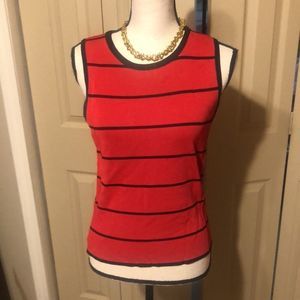 Cach’e beautiful 2 piece sweater set. Very proper attire. Deep Red with black striped sleeveless tank and a button up sweater to match. Size medium. Great condition. Might have a small pick. I took a pic. It really is minimal. I just like to be totally honest