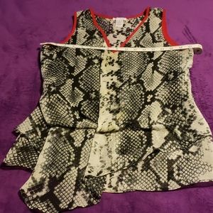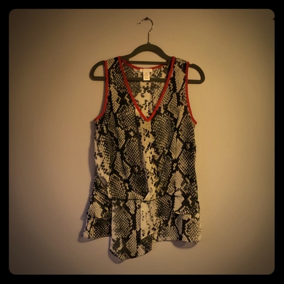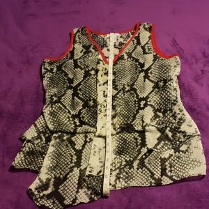 Cache sleeveless blouse is white with black and gray snake print and red trim. This item is a size extra small and is in good condition.