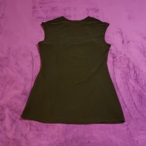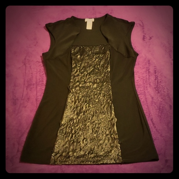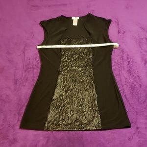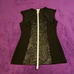 Cache sleeveless tunic is black with black faux leather detailing. This item is a size small and is in new condition.