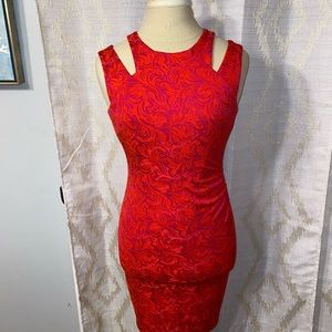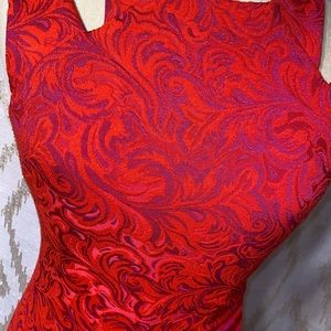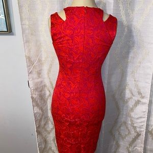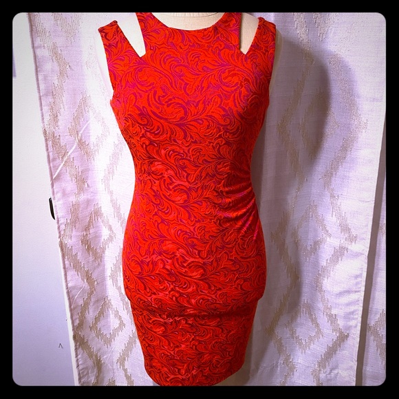 Cache dress size 2p. Red and purple swirl design. Body curving with attractive cut out neck line. Excellent condition!