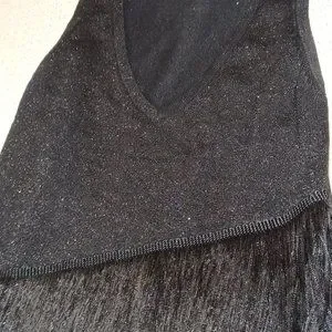 Cache sleevless, dress blouse, black with sparkles, cascading fringe