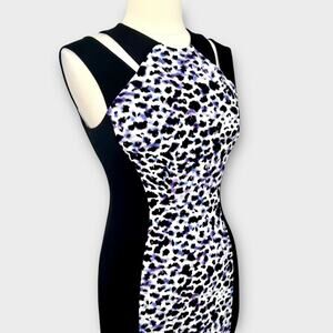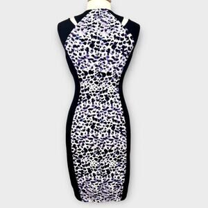 Turn heads in this fierce Cache bodycon sheath dress, featuring a bold abstract animal print in shades of purple, black, and white. The figure-flattering silhouette is enhanced by slimming black side panels and edgy cutout detailing at the neckline. Crafted from a stretchy rayon-spandex blend, this sleeveless dress hugs your curves perfectly and is ideal for nights out, parties, or date night. A hidden back zipper ensures a sleek finish, and it’s fully lined for added comfort.