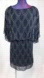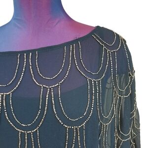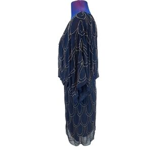 Features beautifully silver beaded scalloped pattern on navy chiffon, cinched elastic waist, fully lined, short flutter sleeves, falls at knee, blouson cocktail dress.