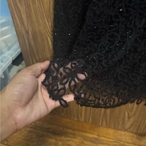 Elegant Cache black evening gown in size 12. Features a sheer mesh neckline with floral lace applique, delicate beaded embellishments throughout, and a long flowing skirt with lace and sequin accents. Perfect for formal events, weddings, prom, or cocktail parties.