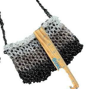This Cache black beaded small evening shoulder purse handbag is a vintage 1980s handmade piece perfect for adding a touch of retro charm to any outfit. The purse features a zip closure, black beaded exterior, and satin lining in black, making it a stylish and practical accessory for any woman's wardrobe. Made with beaded handle/strap material and accents, this vintage handbag exudes unique flair and sophistication, ideal for a night out or special occasion.