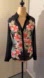 Beautiful sheer black blouse featuring vibrant floral patterns. Sheer fabric adds elegance. Ideal for stylish occasions.