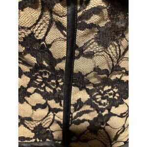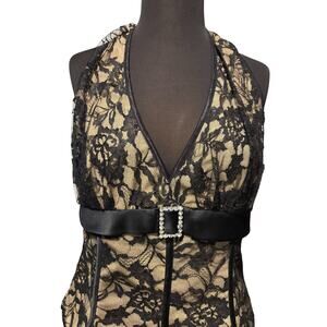 Cache Black Lace Floral Overlay Nude Mesh V Neck Halter Rhinestone Buckle Sz L