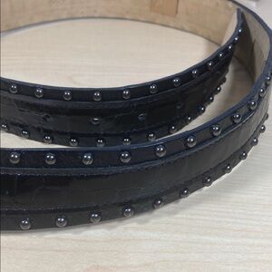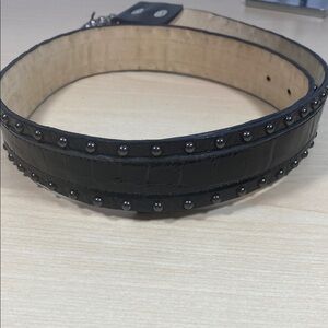 Stylish Cache belt with black studs. Features a large silver tone buckle with intricate detailing. Perfect for adding flair to any outfit. 2 layers of croc embossed shiny leather lined with black rounded studs. A real statement piece.