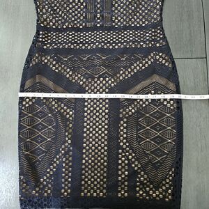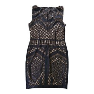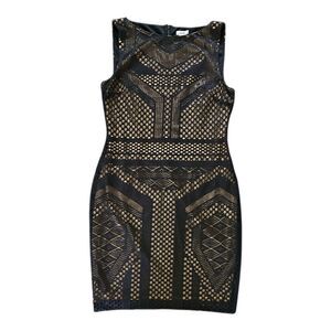 The Cache Black Mesh Lace Illusion Cocktail Party Dress in size 14 is a stylish and edgy choice for those looking to make a statement at an event. The geometric pattern, sleeveless design, and round neckline give it a modern and sophisticated look, while the mesh fabric adds a touch of whimsy and allure. The short dress length and sheath style make it perfect for a party or cocktail event, and the black color adds a sleek and timeless touch. Whether you're going for a goth, grunge, or bohemian vibe, this dress is sure to stand out and turn heads. Excellent condition. See pictures for measurements