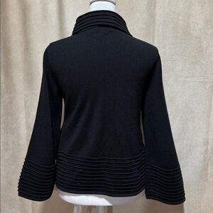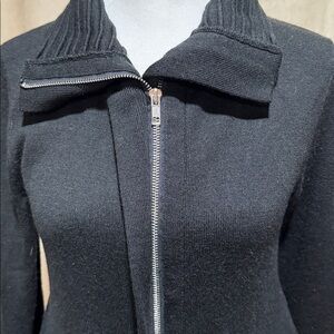Elegant black cardigan with ribbed collar. Features long sleeves and zip closure. Perfect for layering.